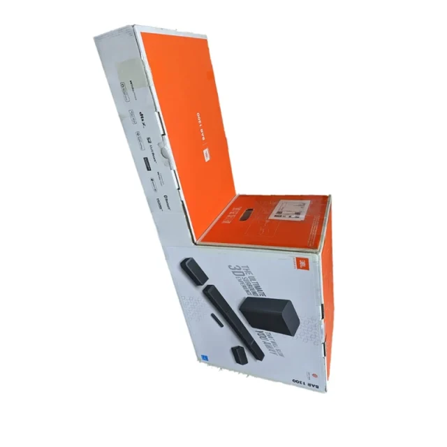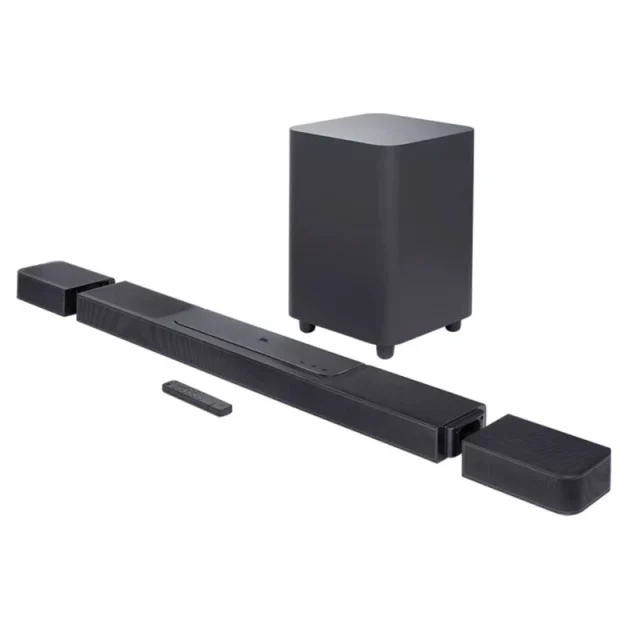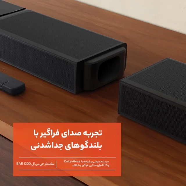 ساندبار حرفهای JBL Bar 1300 با بلندگوهای جداشونده، سابووفر قدرتمند و پشتیبانی از Dolby Atmos، صدای سینمایی فراگیر را به خانه شما میآورد.