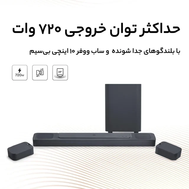 اگر به دنبال تجربهای فراگیر از صدای سینمایی در خانه هستی، JBL Bar 800 انتخابی بسیار مناسب است. این ساندبار مجهز به فناوری Dolby Atmos و بلندی خروجی ۷۲۰ وات، همچنین اسپیکرهای پشتی جداشدنی و باتریدار، صدایی واقعی ۳D بدون نیاز به سیمکشی پیچیده ارائه میدهد.